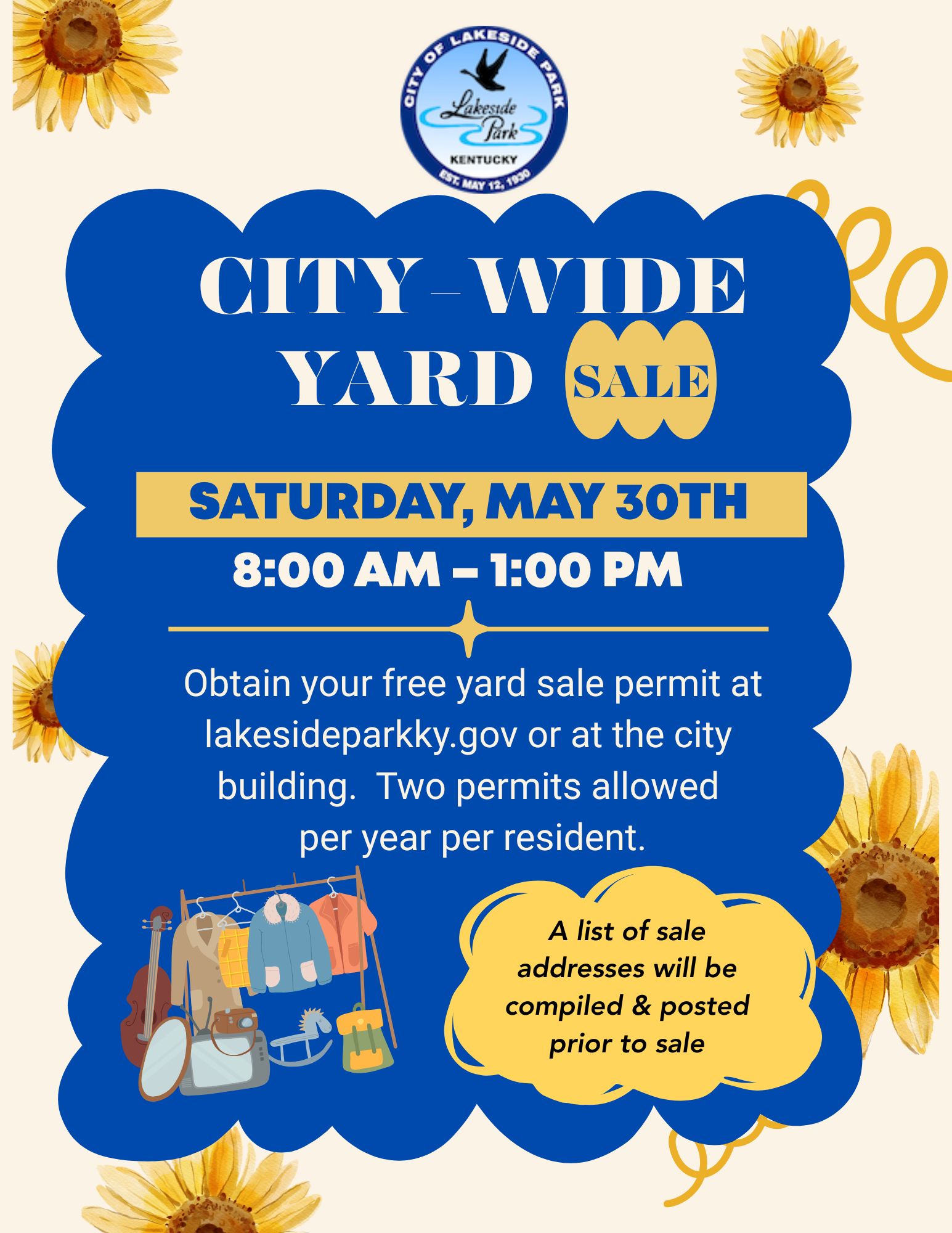 City-wide Yard Sale – May 30th Mar 19, 2026 | News Sign up below for the city-wide yard sale Please enable JavaScript in your browser to complete this form.Please enable JavaScript in your browser to complete this form.Guidelines for participation are as follows: *No sale shall be conducted without a permit having been issued at NO CHARGE. *No residence, family or household may hold more than two (2) sales per calendar year. The Annual City-Wide Garage/Yard Sale shall not be considered in the limitation. *No sale shall be conducted on Sunday. The permit restricts the time of sale to the hours of 8:00 AM to 3:00 PM. *All property for sale shall be located in the garage, driveway, and/or rear yard. No property for sale may be located in the front and/or side yard. * One sign may be displayed on the property of the sale. No signs may be placed on the property of another resident or in the public right-of-way. *General retail sales or commercial sales are prohibited. *Penalties will be enforced as set forth in Ordinance #7-2017. Name *FirstLastAddress *Address Line 1CityAlabamaAlaskaArizonaArkansasCaliforniaColoradoConnecticutDelawareDistrict of ColumbiaFloridaGeorgiaHawaiiIdahoIllinoisIndianaIowaKansasKentuckyLouisianaMaineMarylandMassachusettsMichiganMinnesotaMississippiMissouriMontanaNebraskaNevadaNew HampshireNew JerseyNew MexicoNew YorkNorth CarolinaNorth DakotaOhioOklahomaOregonPennsylvaniaRhode IslandSouth CarolinaSouth DakotaTennesseeTexasUtahVermontVirginiaWashingtonWest VirginiaWisconsinWyomingStatePhone *Email *Date of the Yard Sale ***By submitting this document online, the summit button will constitute your signature as your agreement to the terms of participation in a Yard/Garage Sale within the city limits of Lakeside Park according to Ordinance #7-2017. Submit